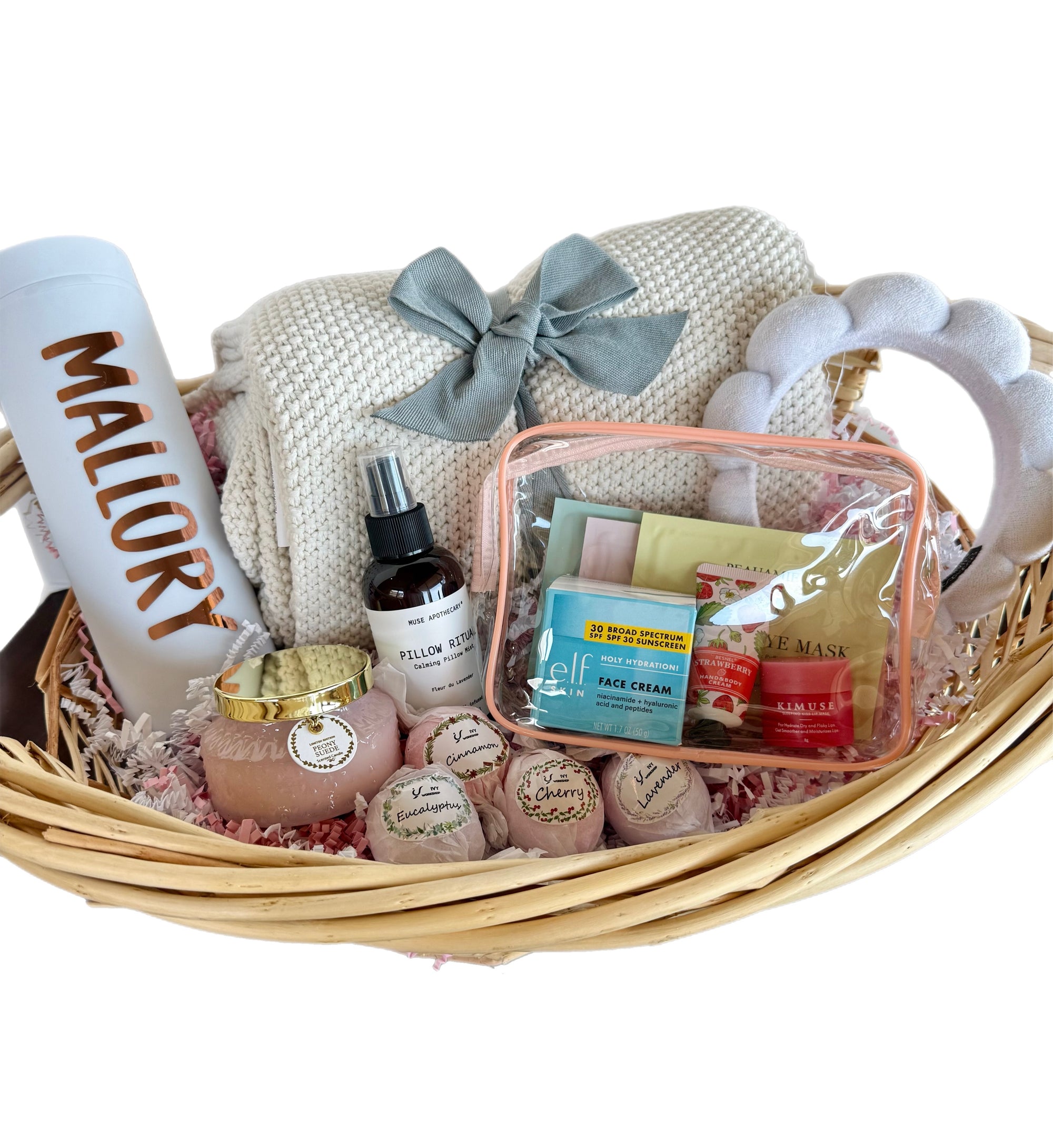 Treat her to the ultimate indulgence with our beautifully curated Celebrating Her gift basket—designed to pamper, uplift, and make her feel truly special. Wrapped in warmth and filled with thoughtful touches, this luxurious bundle includes a soft throw blanket, a personalized tumbler, soothing hand lotion, a delicately scented candle, a clear cosmetic bag, lip mask, eye patches, ELF face cream, a plush spa headband, fizzy bath bombs, and relaxing pillow mist. Whether she’s unwinding, glowing up, or simply celebrating herself, this basket is the perfect way to say: you deserve it all.